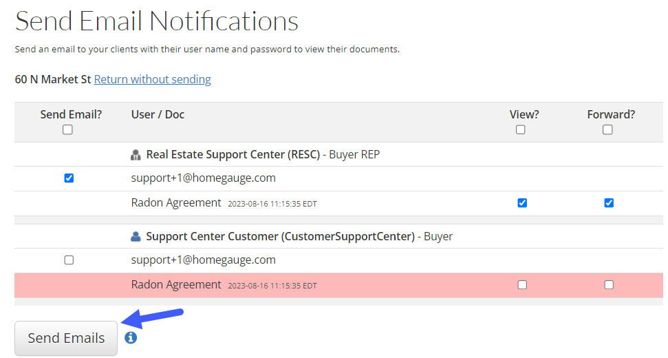 - Send Agreement Emails: Find the relevant property and click the Send Emails: Agreement link.