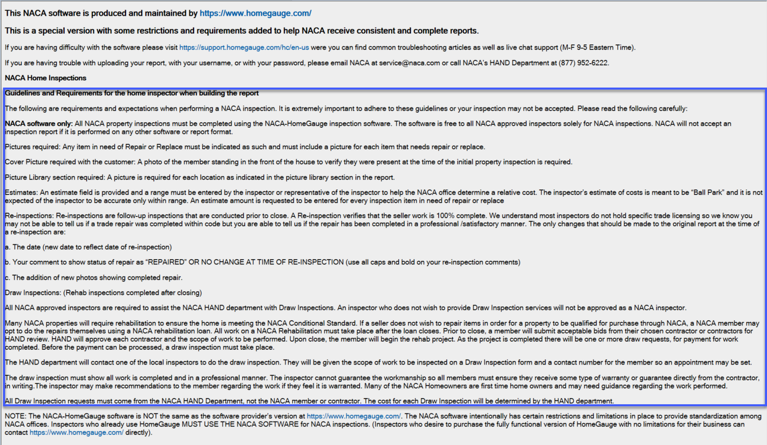 - Read through the Guidelines and Requirements for the home inspector when building the report listed on the home screen of the software. This guideline will list NACA requirements for reports.