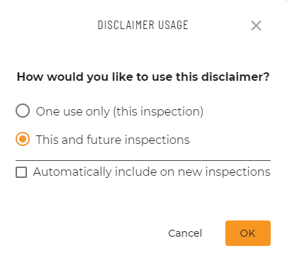 When you add a new disclaimer in the Web Writer, it gives you the option to automatically include the disclaimer on new inspections. Would applying this functionality to the library meet your needs?