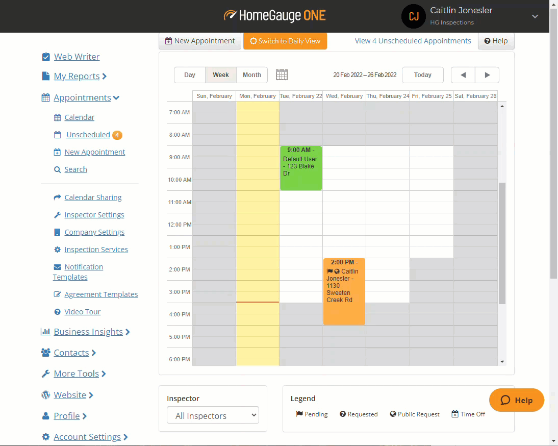 You can now create a Web Writer inspection from an appointment on your dashboard. Click on the "Add Inspection" button from the calendar view or from the Actions button in the edit appointment view.