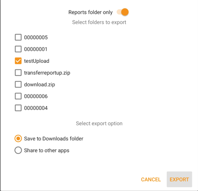Select the export option by tapping 'Save to Downloads folder' to transfer via USB cable to your computer. Tap' Share to other apps' to transfer via another cloud service or email. Note: The size of these reports is generally too large to transfer via email.